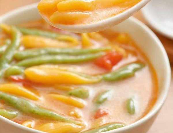 6.加入排骨汤,烧开后下入彩色鱼面儿煮熟,调入盐即可盛出。