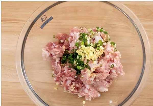1.碗中打入 2 个鸡蛋,划散成蛋液备用;猪后腿肉洗净,剁成肉糜放入碗中,撒入葱花和姜末。