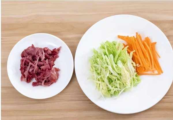 1.胡萝卜去皮,洗净切丝;卷心菜洗净切丝,猪里脊肉洗净切丝;挂面煮熟,捞出过凉水沥干备用。