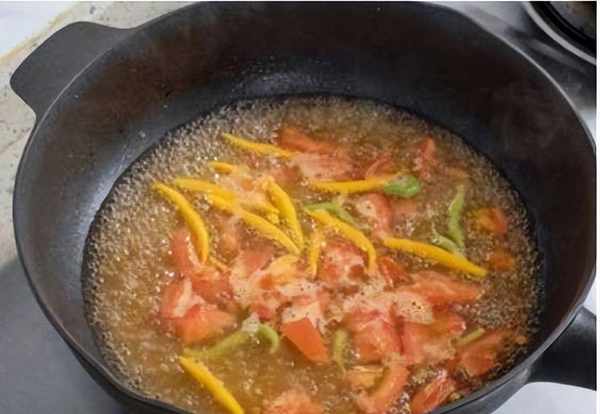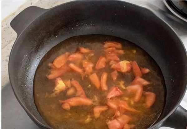 5.锅中倒入食用油烧热,下入番茄煸炒出汁。