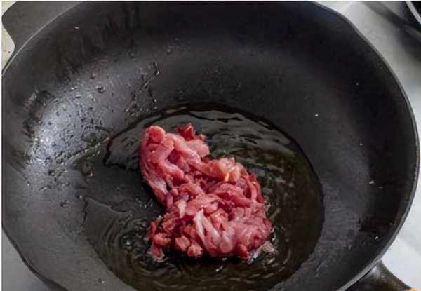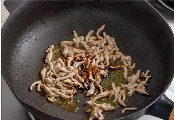 3.另起锅,倒入食用油烧热,下入肉丝中火翻炒,炒出猪油和香味。