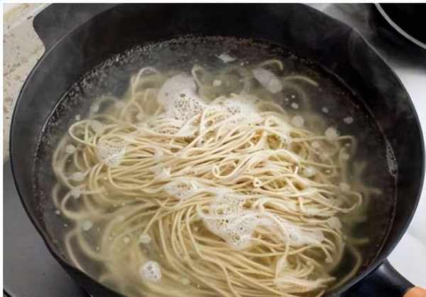 4.另起锅,加入适量水烧开,下入面条稍搅拌;水开后,分两三次加入小半碗凉水,烧开后捞出面条,放入凉水中浸泡。