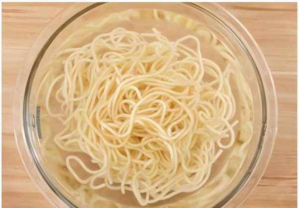 3.调入盐,煮至沸腾后捞出面条过凉水,滴入少许食用油拌匀。