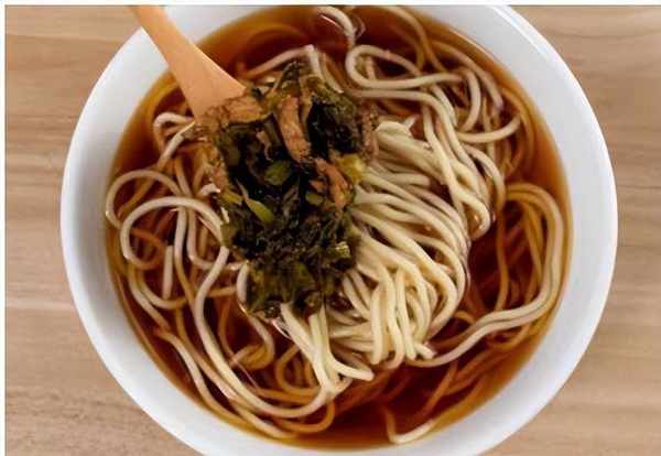 5.取大碗,调入生抽、盐、香油、黑胡椒粉,倒入面汤和面条,舀上炒好的雪菜肉丝即可。