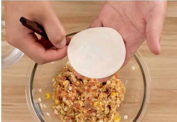 4.舀少许肉馅放在饺子皮中间,对折,然后捏出褶皱。