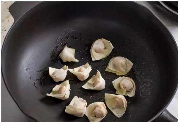 5.锅中刷一层食用油,依次下入馄饨,煎 1 分钟左右,加入少许热水,盖上锅盖,中小火煮 3~5 分钟,收干水分。