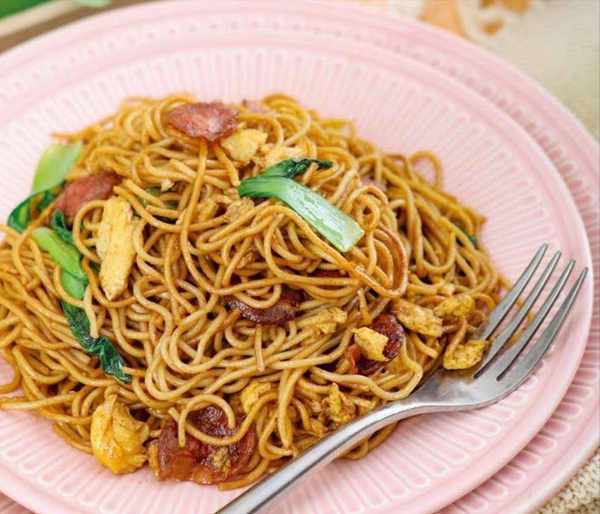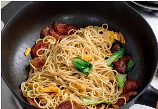 5.下入青菜炒软,再下入面条炒散,调入生抽、老抽,翻炒均匀后装盘。