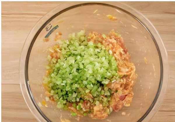 2.打入 1 个鸡蛋,搅拌均匀。芹菜去叶,洗净切碎倒入碗中,调入盐和香油,顺时针搅拌上劲。