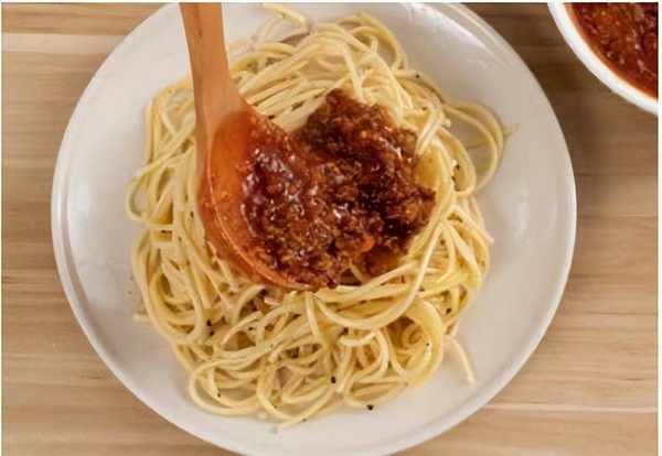 5.另起平底锅,倒入少许橄榄油烧热,下入洋葱丝和意面,炒匀后盛入碗中,撒少许黑胡椒粉,淋上酱汁即可。