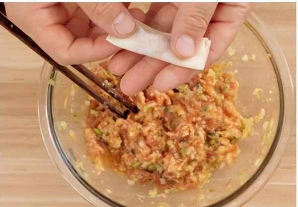 3.手握方形馄饨皮,加适量肉馅,将馄饨皮对折,收口处下方留出 0.5 厘米的边,然后将肉馅周围捏紧。