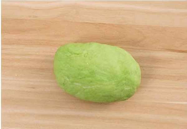4.菠菜汁代替南瓜泥,用同样的方法揉成绿色面团,然后做出绿色的「小鱼」。在做好的「小鱼」上撒上面粉,防止粘在案板上。