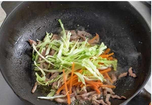 4.下入卷心菜丝和胡萝卜丝,翻炒至变软,调入老抽激出香味。