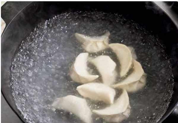 6.煮至水开后,再加一碗凉水烧开,煮至饺子全部浮起来后捞出装盘,蘸香醋食用。