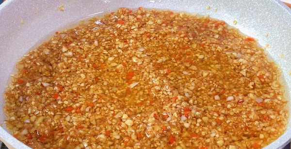 2、一斤蒜蓉大概是400克油,油温烧至三成热,先倒入一半的蒜蓉,开中小火翻炒,直到炸成微微黄色。再将火调到最小,再把剩下的一半倒下去。翻拌均匀后,把红椒丁倒进去,放入一勺生抽,蚝油,鸡精,充分的翻炒均匀即可。