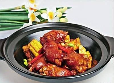 2.锅中放油,下入猪脚。煸炒后,倒入玉米棒同炒,然后加入适量清水,放盐、味精和酱油调味,大火煮开后,去除浮沫,移至小火炖 30 分钟左右。待猪脚皮面松软时,下入青皮豆和切好的泰椒,焖 5 分钟左右。收汁出锅,装盘即可。