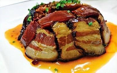 3.锅中放油,下入洗好的乡里干菜,放入盐、味精和干辣椒粉,煸炒出香味后,盖在五花肉上,然后上笼,大火蒸 30 分钟左右取出,扣入盘中,撒上红椒末和葱花点缀即可。