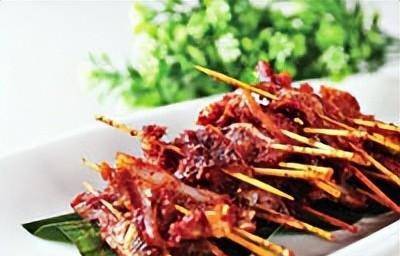 3.将卤好的脆骨切成 7 厘米长的片,用竹签逐个穿好。撒上辣椒粉、孜然粉、椒盐粉和花椒粉,拌匀,淋香油后入烤箱 180℃ 烤 10 分钟左右取出,放在装有粽叶的盘中即可。