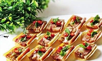 一、原料:新鲜猪耳 750 克 油炸薯片 20 克 泰椒 10 克 小青瓜 50 克 薄荷叶 10 克