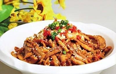 3.将卤好的牛肚切成 5 厘米长的条,倒入盆中加上切好的蒜子、红椒和去皮花生仁,再加入食用油、红油、味精和生抽调味,翻拌均匀。撒上熟芝麻装盘,撒上葱花即可。