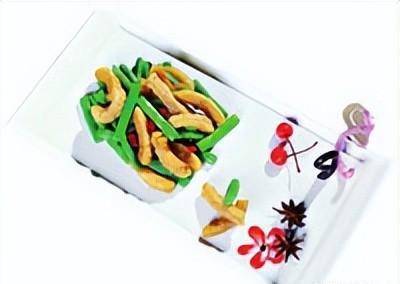 1.带皮肥膘切成 2 厘米宽、6 厘米长的条,四季豆切 5 厘米的段。