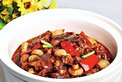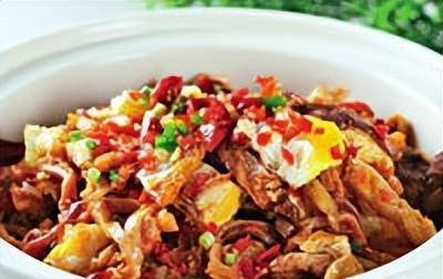 5.锅中放油,下入干红椒节煸炒出香。倒入切好的猪肚、猪肠、猪心、拆骨肉和鸡蛋,加入高汤,放盐、味精、生抽、蚝油、胡椒粉调味后,焖 3 分钟左右。收汁出锅,撒上切好的红椒末和葱花点缀即可。