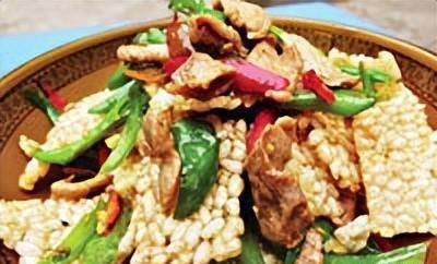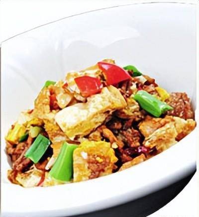 3.锅巴下入七成热的油锅内,炸至呈金黄色捞出,沥干油。锅内留 20 克热油,下入猪肥肉炒出油后,再下入猪瘦肉煸炒至断生出锅。锅内再放入 20 克油烧热,下入青辣椒、红辣椒,加盐、酱油 5 克炒熟,倒入猪肉、加入味精炒入味,淋入香油,勾薄芡。倒入锅巴,快速翻匀,出锅装盘。