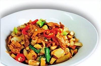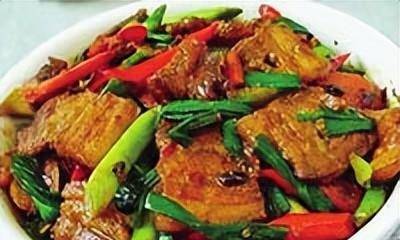 3.锅烧干,放油烧热,下入肥肉煸香出油,再下入猪瘦肉炒熟出锅。锅内留热油,下入酸泡椒、大葱,加酱油稍炒,随即下入肉片、味精炒入味,淋入香油,出锅装盘。