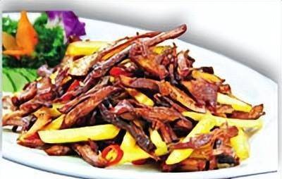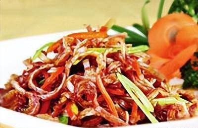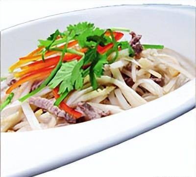 1.将牛肉去掉筋膜,切 6 厘米长的粗丝。