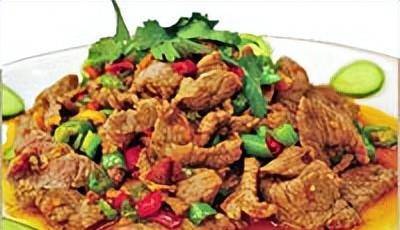 一、原料:黄牛瘦肉 250 克 泡红椒 50 克 黄酱椒 50 克 香菜 80 克