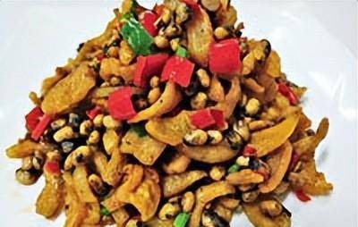2.锅中放少许油烧热,将腊八豆下锅,煸炒出香味出锅。