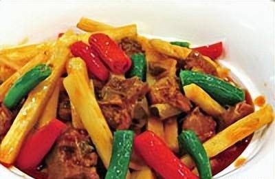 二、调料:植物油 50 克 盐 5 克 味精 2 克 胡椒粉 10 克 料酒 10 克 生姜 10 克 桂皮 5 克 八角 5 克 干锅油 10 克 牛肉汤(牛骨头熬制)400 克