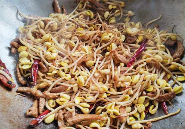 6.下入黄豆芽翻炒2-3分钟,将黄豆芽炒至稍变软,没有生豆味。