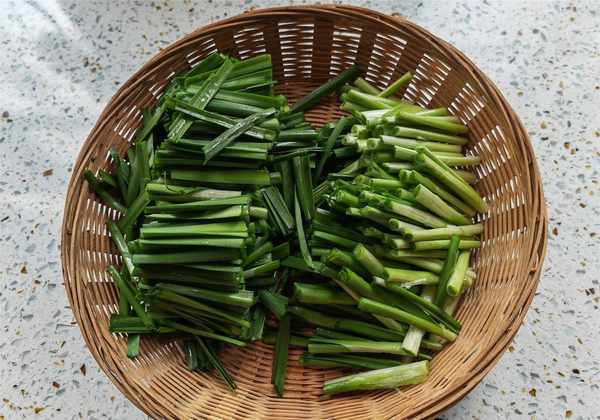 2.把韭菜靠近根部的部位切去一小段,再把韭菜切成段。