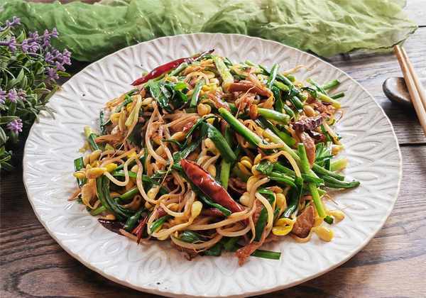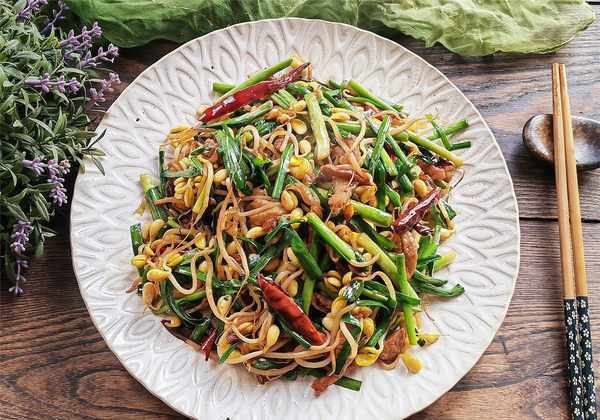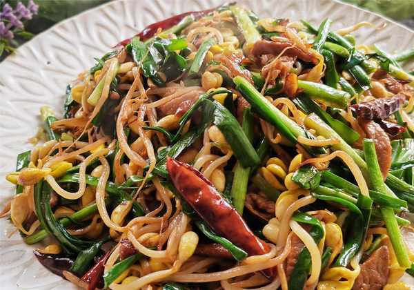 【黄豆芽炒韭菜】所需材料:黄豆芽半斤、韭菜1把、猪肉100克、油盐适量、花椒10几粒、干辣椒3-4个、生抽1汤匙、鸡精1茶匙、料酒半汤匙、