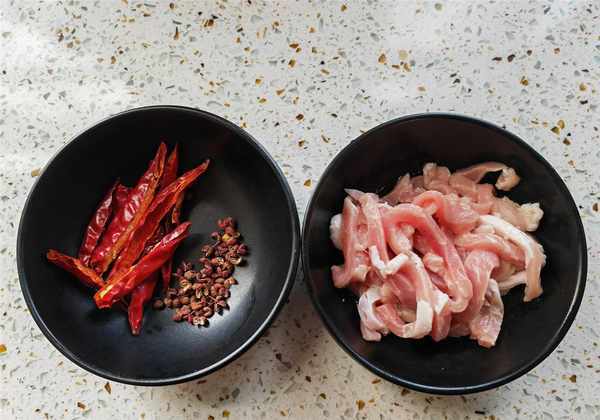 3.猪肉切成丝,干辣椒剪成两半,辣椒籽不要。