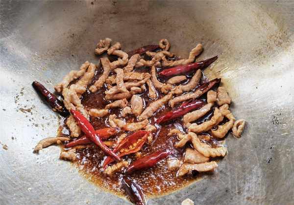 5.下入干辣椒段炸香,再下入猪肉丝翻炒,将肉丝炒至颜色变白,淋入生抽和料酒,将肉丝翻炒上色。