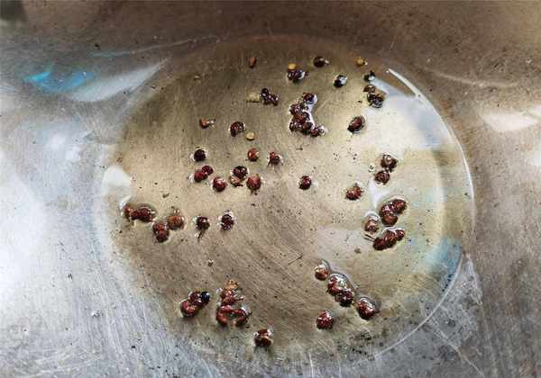 4.锅内加入油烧热,下入花椒小火炸制,小火将花椒炸至微焦,将花椒捞出不要。