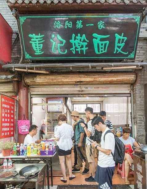 今天講的就是三皮之一的擀面皮,就在洛陽十字街的西大街上。門上掛著一個大大的牌匾,名字霸氣十足,號稱洛陽第一家董記擀面皮,每天來的人絡繹不絕。是只要有外地人問,洛陽有什麼老牌美食,這一家必定會被推薦的程度。