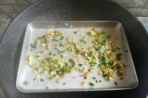 第九步:把肠粉盘子放到烧开水的锅里,大火蒸1分钟左右,肠粉面浆变透明冒泡鼓起就可以出锅了。第一盘肠粉从舀面浆到蒸熟,大概2分钟出一盘,后面盘子受热了,基本上1分钟蒸一盘。