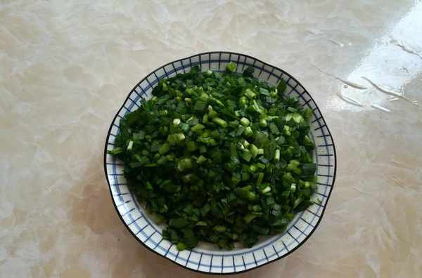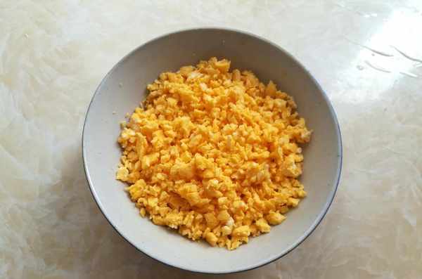 第三步:鸡蛋加少量的盐打散,热锅后放入适量的油,放入鸡蛋液煎到凝固后,盛出来切成跟韭菜差不多大的鸡蛋碎。