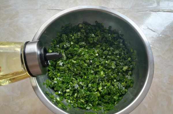 第四步:韭菜里加3汤匙的玉米油,这样做可以避免韭菜遇高温蒸出汁水。平时做韭菜馅饺子也可以先加一些玉米油再跟其他食材拌匀。