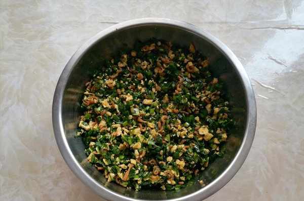 第五步:韭菜里加入鸡蛋碎、泡好的虾仁、五香粉和适量的盐混合均匀。这个时候去烧一锅热开水。