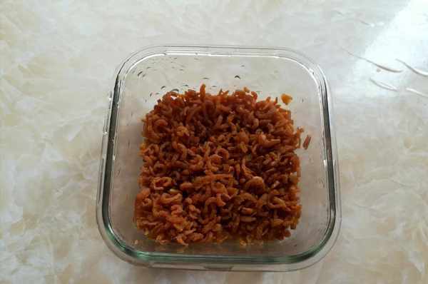第一步:干虾仁用水简单清洗一下,再加温水泡软沥干水分。如果家里有新鲜的大虾更好,去掉虾线,剥掉虾壳切小块。
