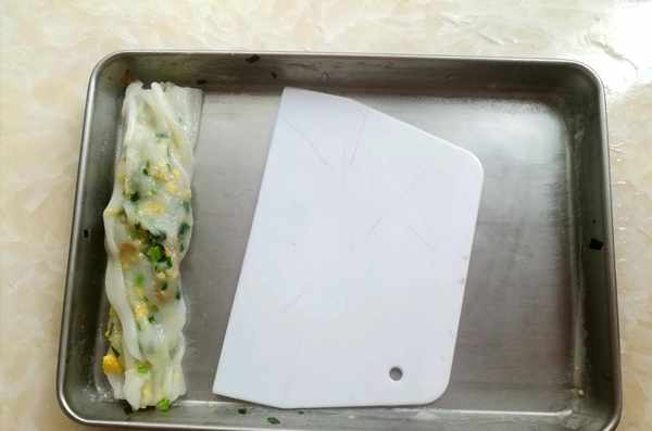 第十步:用一个小刮板,把蒸熟的肠粉从右边往左边铲起来,一边铲一边卷。铲出来以后继续舀入肠粉面浆,同样的步骤蒸完所有的肠粉面浆。