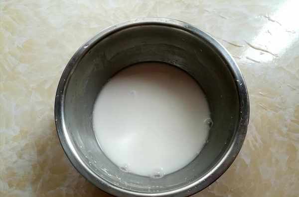 第六步:准备一个有深度的盆子,放入1碗大米粉加1汤匙澄粉,加3碗水混合均匀成肠粉面浆。大米粉和澄粉的比例是9比1,加澄粉吃起来才有爽滑的口感,也可以直接买配比好的肠粉专用粉。