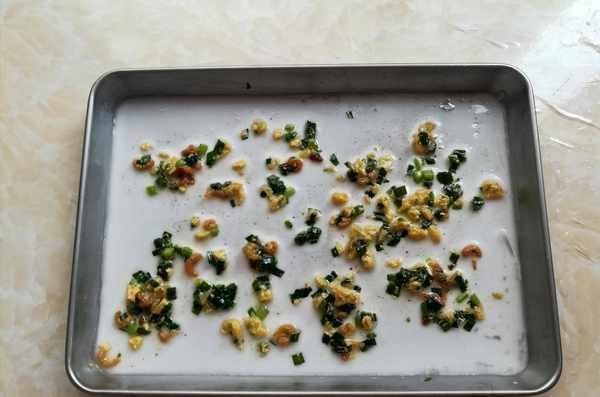 第八步:在肠粉面浆里放上适量的韭菜馅,尽量铺均匀一些。