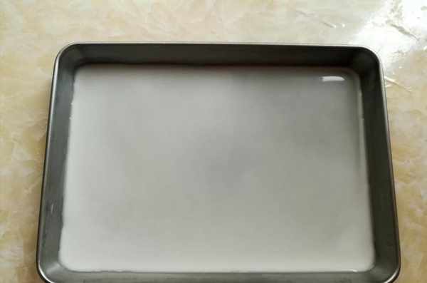 第七步:准备一个蒸肠粉的盘子,方形圆形都可以,在盘子里抹一点点玉米油,舀一大勺肠粉面浆,晃动一下,让面浆均匀的铺满盘子。