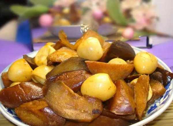 鹌鹑茄子选用嫩茄子切成小块,在油锅中炸至金黄捞出,在另一个锅中加入油、姜、蒜、辣椒、花椒等爆香后放入炸好的茄子和适量的水、盐、糖、醋等调料烧开后转小火收汁即可。此菜色泽红润,口感软烂而不碎,香辣适口,开胃下饭。