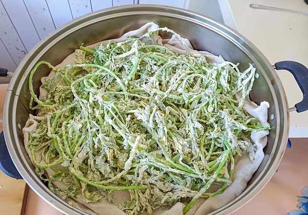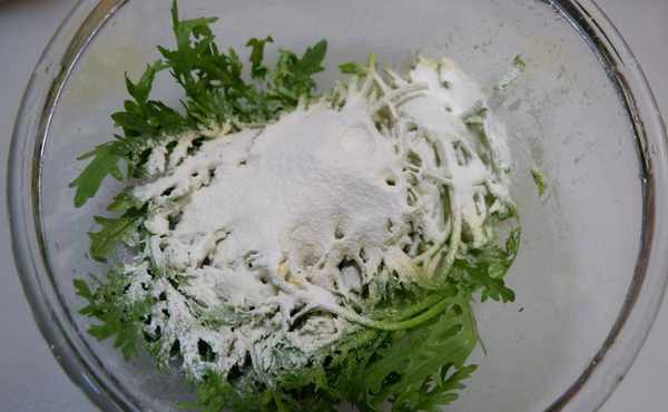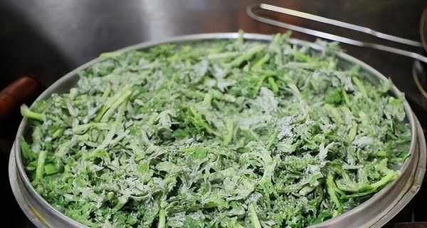 4.面粉的数量不需要加的太多,分三次加入就可以了。最后让面粉全部均匀的裹在野菜上面。然后再把准备好的野菜直接放在蒸好的笼屉上面就可以了。用手铺匀。