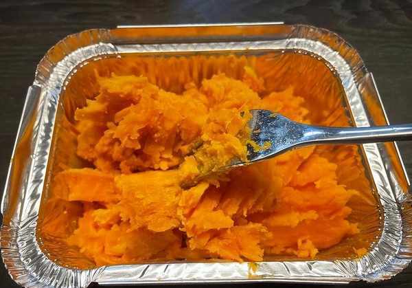 把焗好的红薯取出,切开,即可享用美味的焗红薯早餐。